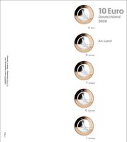 Vordruckblatt mit den Abbildungen der 10 Euro-Sammlermünze 2020 (jew. alle 5 Prägestätten) inkl. karat-Münzblatt K3. Format: 188 x 210 mm.