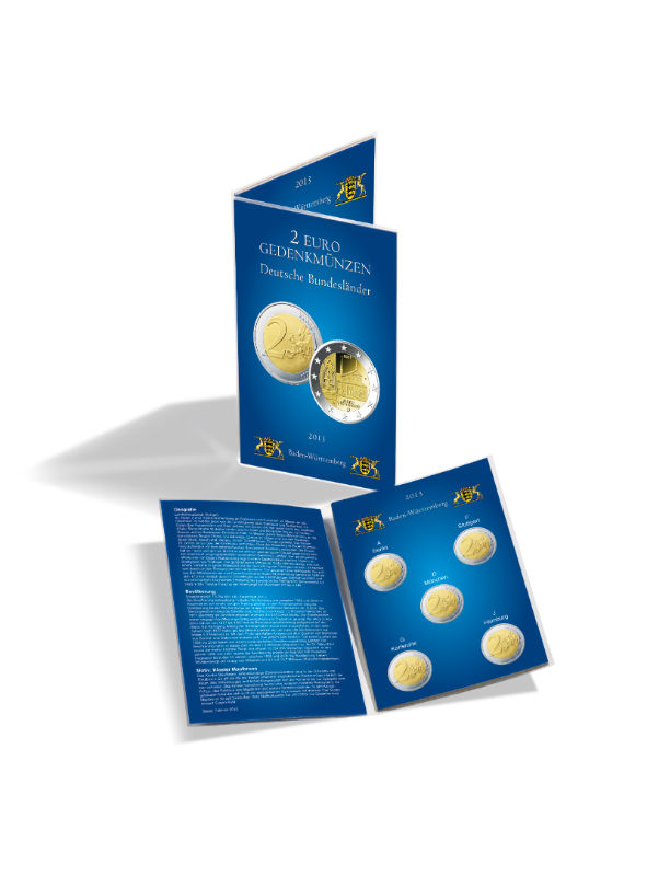 Sammelkarte aus stabilem Karton mit Ausstanzungen für fünf deutsche 2-Euro-Gedenkmünzen Baden-Württemberg" (Jg. 2013). Untergebracht in einer glasklaren, weichmacherfreien Kunststoff-Folie. Die Münzen sind beidseitig zu betrachten. Außenformat (aufgeklappt): 106 x 144 mm. Optimal als Geschenkverpackung."