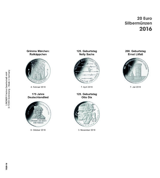 Lindner Vordruckblatt für 20€ Silbermünzen Deutschland 2016 Nr. 1520-16