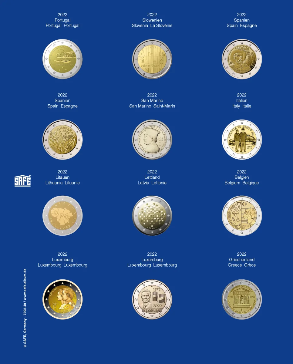 Safe TOPset Album für 2€ Nachtrag 2022 Nr. 7302-40 für TOPset Album 7302 (2€-Münzen). Für 2€ Münzen in Kapseln. Die TOPset-Blätter bestehen aus einem transparenten Eindrückblatt (die Münzen sind beidseitig sichtbar) und einem farbigen Vordruckblatt. Blatt für Jahrgang 2022/2023