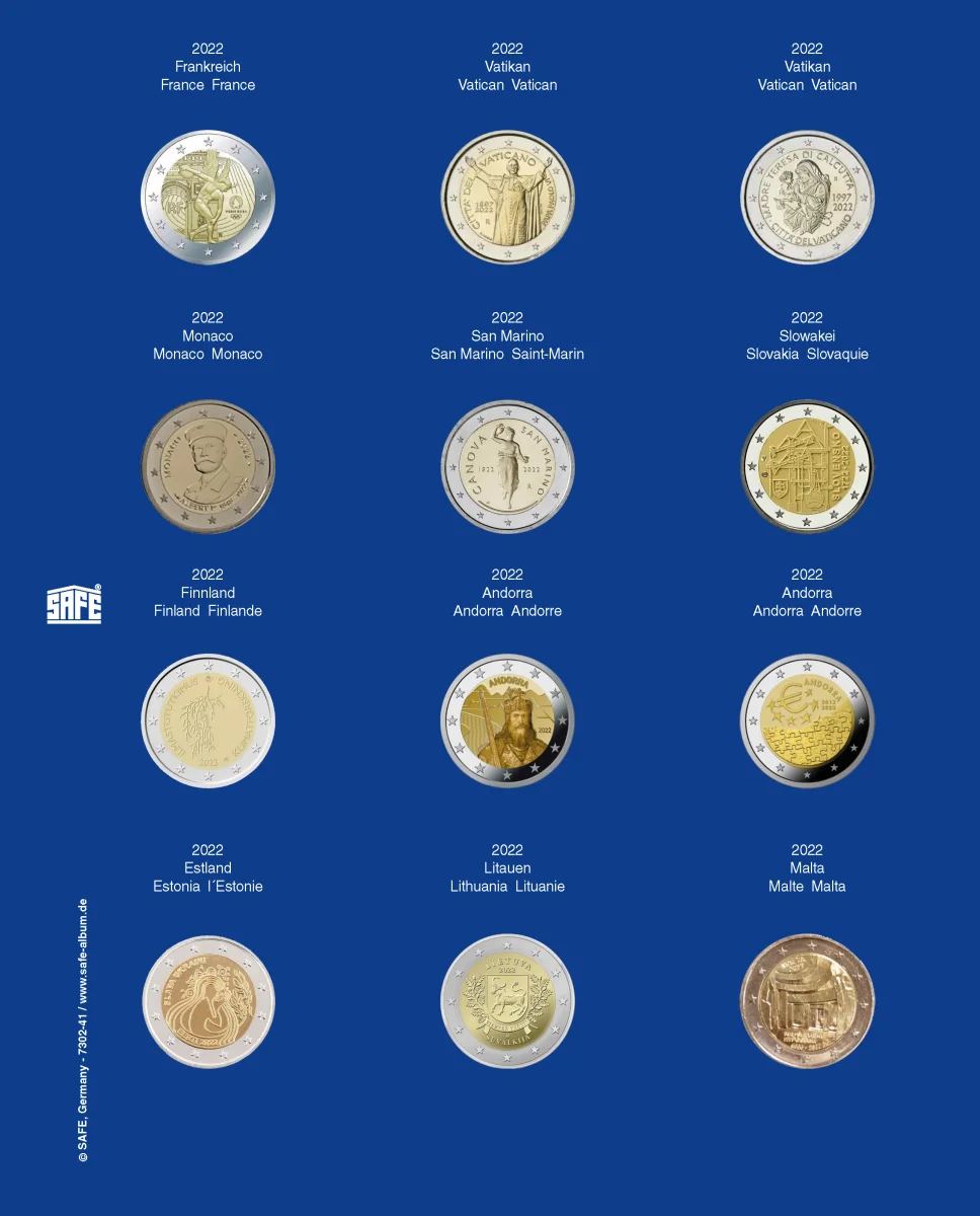 Safe TOPset Album für 2€ Nachtrag 2022 Nr. 7302-41 für TOPset Album 7302 (2€-Münzen). Für 2€ Münzen in Kapseln. Die TOPset-Blätter bestehen aus einem transparenten Eindrückblatt (die Münzen sind beidseitig sichtbar) und einem farbigen Vordruckblatt. Blatt für Jahrgang 2022/2023