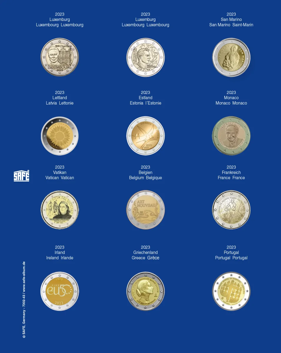 Safe TOPset Album für 2€ Nachtrag 2023 Nr. 7302-43 für TOPset Album 7302 (2€-Münzen). Für 2€ Münzen in Kapseln. Die TOPset-Blätter bestehen aus einem transparenten Eindrückblatt (die Münzen sind beidseitig sichtbar) und einem farbigen Vordruckblatt. Blatt für Jahrgang 2023