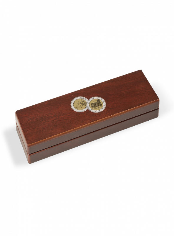Etui zur Unterbringung der 5 deutschen 2-Euro-Gedenkmünzen 2017 „Rheinland-Pfalz„ (Prägebuchstaben A, D, F, G, J) in Kapseln (InnenØ 26 mm). Edle, mahagonifarbene Holzmaserung. Themenspezifischer Deckeldruck (Münzmotiv: Porta Nigra). Deckelkissen mit
