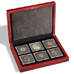 Münz-Etui in mahagonifarbener Holzmaserung zur Aufbewahrung von 6 QUADRUM-Münzkapseln. Deckelkissen mit schwarzem Satin gepolstert. Bodenteil mit veloursartiger Oberfläche. 6 Vertiefungen von 50 x 50 mm. Besonders leichtes Herausnehmen der QUADRUM-Münzkapseln durch integrierten Kipp-Mechanismus". Außenmaß: 193 x 150 mm.