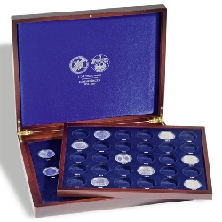 Hochwertige Münzkassette mit 2 Einlagen für 43 deutsche 5-DM-Gedenkmünzen der Jahre 1952 - 1986 in Kapseln (CAPS 29). 1 Einlage mit 30 runden Feldern (Ø 35 mm) und 1 Einlage mit 13 runden Feldern (Ø 35 mm). Kassette in mahagonifarbener Holzmaserung und Einlagen mit veloursartiger Oberfläche. Beschriftung der Einlagen mit Jahreszahlen. Edler Deckel- und Kissendruck. Sicherer und unauffälliger Magnetverschluss. Außenformat: 330 x 270 x 55 mm.(Kapseln nicht im Lieferumfang enthalten).
