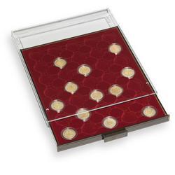 Diese Münzbox ist mit einer dunkelroten Einlage ausgestattet. Die Schublade für diese Einlage ist in einem rauchfarbenen Ton gehalten. Diese Münzboxen sind speziell für Leuchtturm-Münzkapseln geeignet, Sie können problemlos die Kapseln einlegen und wieder herausnehmen. Die 35 runden Fächer sind für Münzkapseln bis zu einem Außendurchmesser von 32 mm (CAPS 26) verwendbar. Die Kapsel CAPS 26 ist z.B. für die 2-Euro-Münze vorgesehen. Außenformat (B/L/H) 236 x 303 x 20 mm.