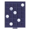 Glaskl. Stapelrahmen mit dunkelblauem Einschub, samtblaue Einlage, 30 Felder bis 33mm Durchmesser, Fächer, passend für Bankschließfächer. Außenformat (H/B/T): 19 x 195 x 250 mm