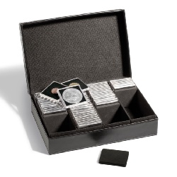 Münzkassette zur Unterbringung von bis zu 100 QUADRUM-Münzkapseln. Münzkassette gefertigt aus schwarzem Kunstleder (wattiert). Die im Lieferumfang enthaltenen 4 „Stopper„ dienen der Fixierung nicht vollständig gefüllter Reihen (kein Umkippen der Kapseln). Auch zur Unterbringung von Münzrähmchen (50 x 50 mm) geeignet (ca. 320 Stück). Außenformat: 225 x 181 x 77 mm