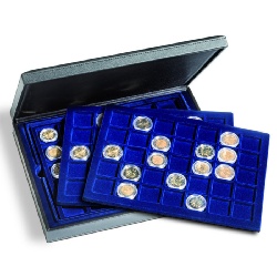 Münzkassette aus edlem, schwarzem Kunstleder (wattiert) zur Unterbringung von 105/90/60 Münzen oder Münzkapseln bis 35 mm Ø/39 mm Ø/48 mm Ø. Inkl. 3 Einlagen mit blauer, veloursartiger Oberfläche und je 35 eckigen Feldern (35 x 35 mm). Deckelkissen mit schwarzem Satin gepolstert, inkl. Satinbändchen zur Aufnahme von Zertifikaten. Mit flexiblen Federscharnieren. Außenformat: 340 x 55 x 265 mm.