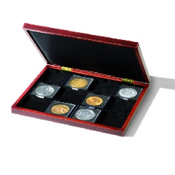 Edle 1-lagige Münzkassette zur Unterbringung von 12 Münzkapseln QUADRUM XL oder Münzrähmchen XL (67x67mm). Edle mahagonifarbene Holzmaserung. 1 Einlage mit schwarzer, veloursartiger Oberfläche. Deckelkissen mit Satin gepolstert. Mit 2 vergoldeten Scharnieren und sicherem Magnetverschluß. Außenformat: 305 x 245 x 30 mm