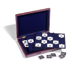 Münzkassette im edlen mahagonifarbenen Holzdesign, inkl. Drei Velourtableaus, mit Magnetverschluß. Für 60 Münzenrähmchen 50 x 50 mm. 3 Einlagen mit je 20 eckigen Feldern. Außenformat: 343x265x48 mm.