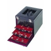 Mit echtem schwarzen Leder, passend für 10 Standard-Münzboxen , versenkter gezogener Tragegriff, Außenmaß (L/B/H): 341 x 263 x 257 mm.