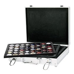 Abschließbarer Alu-Münzkoffer mit 5 schwarzen Münztableaus mit je 48 quadratischen Fächern.