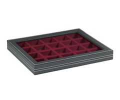 •mit einer hellroten Einlage mit 6 quadratischen Fächern 85 x 85 mm / Max. Füllhöhe 18,5 mm.