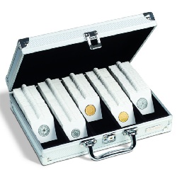 Münzkoffer mit 5 Reihen zur Aufbewahrung von bis zu 650 Münzrähmchen oder 150 QUADRUM-Münzkapseln. Besonders großes Fassungsvermögen. Inkl. 5 „Stopper„ zur Fixierung nicht vollständig gefüllter Reihen (kein Umkippen der Rähmchen). Komplett ausgekleidet mit schwarzem Velours. Abschließbar (2 Schlüssel). Stabiler Rahmen, verstärkt mit Eckbeschlägen aus Aluminium. Handlicher und formschöner Griff. Der Koffer eignet sich ideal für den mobilen Transport. Außenformat: 292 x 74 x 238 mm. (Koffer wird ohne Münzenrähmchen geliefert)