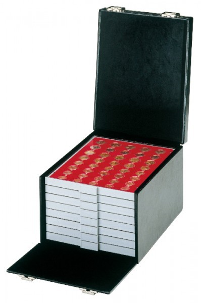 •Abschließbarer Boxen-Koffer mit schwarzem Kunstlederbezug, geeignet für 8 Münzboxen oder 4 LINDNER Sammelboxen.