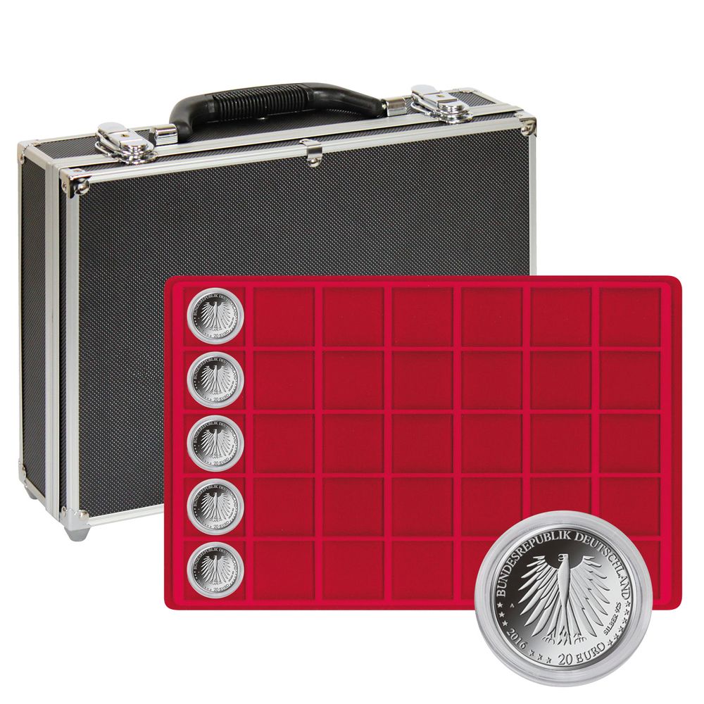 Lindner Großer Münzen-Sammelkoffer mit 8 Münztableaus 2338-280 für 280 Münzen oder Münzkapseln bis 39 mm Ø