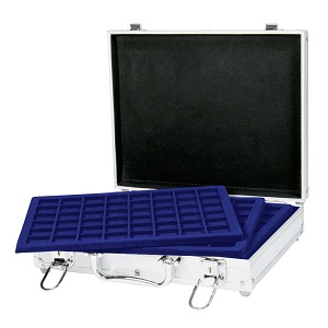 Abschließbarer Alu-Münzkoffer mit 6 dunkelblauen Münztableaus mit je 48 quadratischen Fächern.