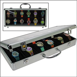 Safe Design Alu-Koffer für 12 Uhren Nr. 262Der schicke Aufbewahrungsort für 12 Armbanduhren. Mit metallverstärkten Ecken und Kanten. Transparente Abdeckung. Innen in edlem Schwarz ausgekleidet. Mit 12 samtbezogenen Uhrenhaltern in schwarz (herausnehmbar). Mit extrabreiten Fächern, dass auch moderne Sammleruhren darin Platz finden (65 x 80 mm). Abschließbar mit 2 Schlössern. Maße: 430 x 190 x 70 mm.