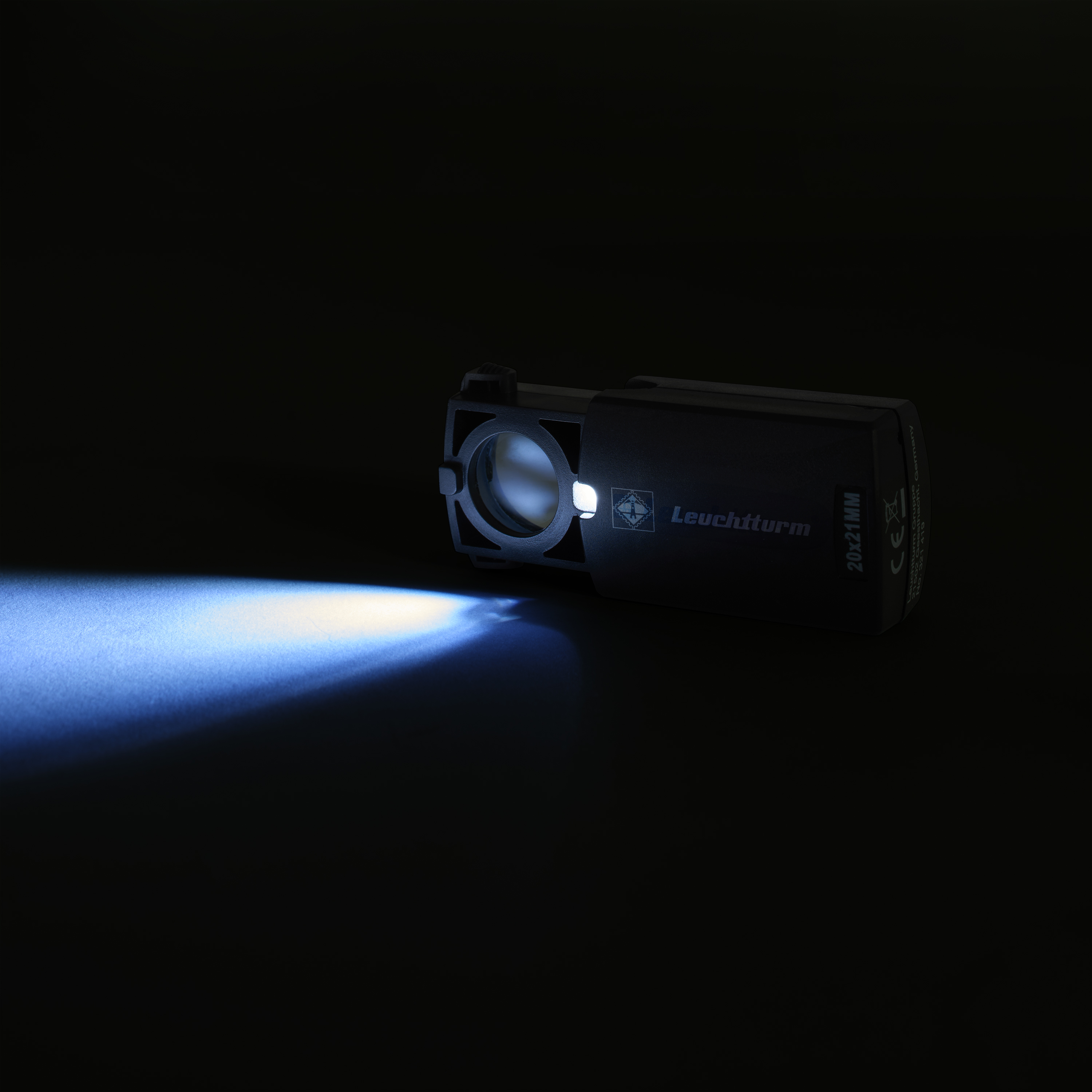 Leuchtturm LED-Aufziehlupe 321419/LU30LED, 20x Vergrößerungschwarzes mattes Kunststoffgehäuse, 1 LED-Leuchte, Linsendurchmesser: 21 mm (Batterien im Lieferumfang enthalten).