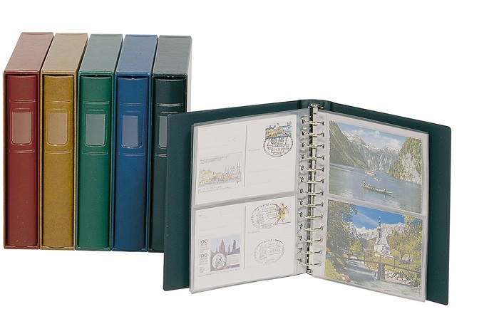 Postkarten-Album mit 20 Klarsichthüllen aus weichmacher- und säurefreier, glasklarer Hart-PVC-Folie; Ringbinder aus geschäumter Folie „Yorn„, wattiert. Format 20 x 23,5 cm, 13-Ring-Mechanik, mit Blattwendern und Rückenfenster zur Inhaltsmarkierung; Fassungsvermögen ca. 140 Postkarten (ca. 35 Hüllen).