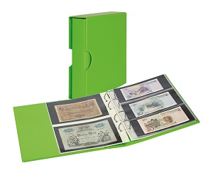 Publica M Color Banknotenalbum Spring hellgrün mit passender Schutzkassette Nr. S3542BN-4 Wattierter Ringbinder PUBLICA M COLOR mit 10 glasklaren Multi collect Blättern aus weichmacherfreier Hart-PVC-Folie und mit passender Schutzkassette.