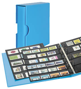 Publica M Color Briefmarkenalbum Nautiv hellblau mit passender Schutzkassette Nr. S3542B-5 mit 10 beidseitig bestückbaren Folien-Einsteckblättern in 2 Varianten.
